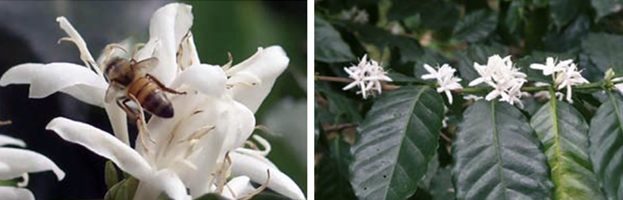 Fig 2. La abeja común (Apis mellifera) polinizando las flores de un cafeto en el centro del estado de Veracruz. El transporte de colonias de esta abeja a parcelas de muchos cultivos es una práctica común para maximizar la producción. Sin embargo, las poblaciones de esta especie están amenazadas por exceso de pesticidas y parásitos. Si disminuyen estas poblaciones entonces dependeremos de las poblaciones de abejas nativas como respaldo para seguir polinizando nuestros cultivos (fuente: C. Vergara Briceño).