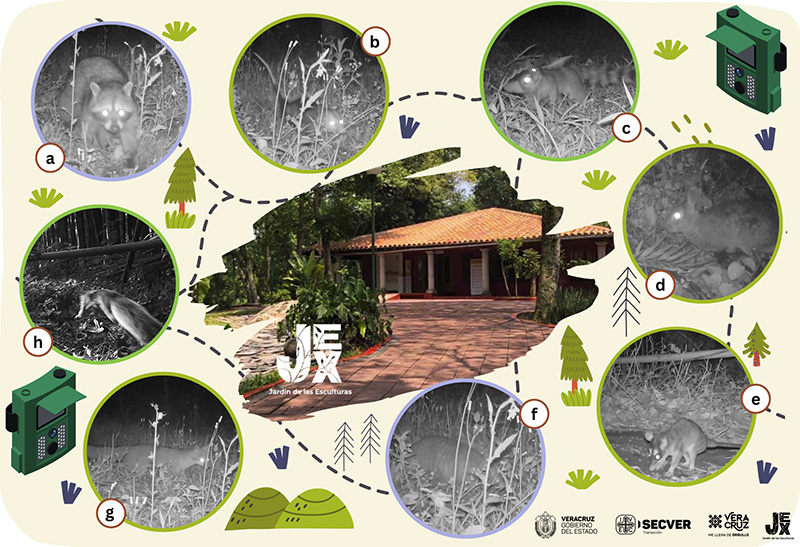 Entre 2019 y 2020 inició el proyecto “Flora y Fauna del Jardín”, una iniciativa integral para conocer la biodiversidad que habita en el Jardín de las Esculturas (JEX), un recinto del Instituto Veracruzano de la Cultura que colinda con el Tejar-Garnica (Área Natural Protegida de 133 hectáreas) y que resguarda una colección de arte tridimensional a la sombra de árboles nativos, exóticos y ornamentales. Durante varios meses (a inicios de la pandemia), un par de cámaras trampa fueron instaladas en diferentes partes del JEX, mismas que permitieron registrar a ocho habitantes silvestres que durante el crepúsculo y la noche hacen de este espacio su hogar.