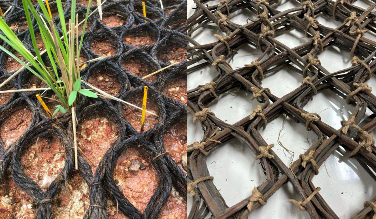 Geocélulas: estructura celular tridimensional, similar a un panal, hecha de fibras naturales para estabilizar taludes. Crédito: Marçal Rodrigues Marçal
