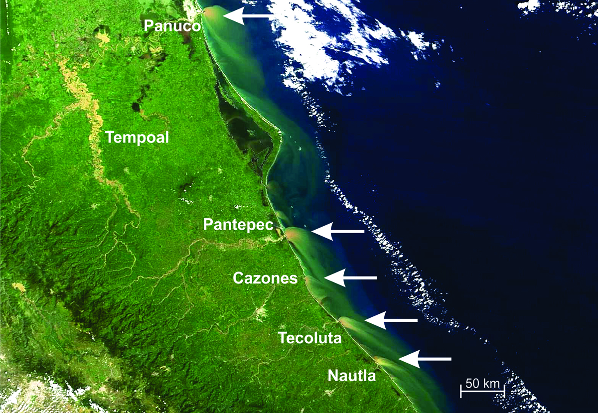Plumas de sedimentos terrestres en las desembocaduras de los ríos Pánuco, Tuxpan, Cazones, Tecolutla y Nautla registradas el 12 de octubre de 2025. Se observa el color ocre que marca la gran extensión del caudal del río Tempoal, que desemboca en el río Pánuco. Fuente: imagen satelital Terra/MODIS, https://terra.nasa.gov