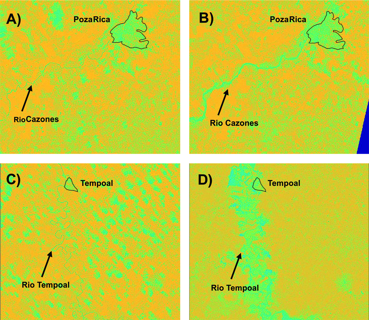 Imágenes satelitales compuestas por el índice NDVI. El agua se observa en azul claro sobre la región de Poza Rica y Tempoal. (A) El 4 de octubre se aprecia el caudal del río Cazones y la ciudad de Poza Rica previa a las lluvias. (B) El 12 de octubre, después de las lluvias masivas en la misma región de Poza Rica, el área ocupada por el caudal del río Cazones aumenta dramáticamente y se aprecian las regiones inundadas al norte y noroeste de la ciudad de Poza Rica. (C) El 4 de octubre, en el municipio de Tempoal se observan nubes pequeñas que, al contener agua, aparecen como pequeñas manchas de color azul claro. El caudal del río Tempoal es pequeño. (D) Por el contrario, el 12 de octubre son evidentes el caudal acrecentado del río Tempoal y las regiones inundadas, entre las que están El Higo, Zapote Real, Tancheche y Dos Rayas, entre otras localidades. Fuente: https://www.copernicus.eu/