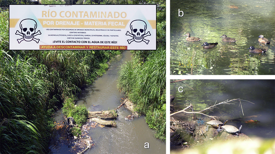 Rio Sordo, limite municipal Xalapa-Coatepec, Veracruz (a: letrero informativo en el puente de la carretera antigua a Coatepec; b: cercetas de alas azules (Spatula discors) descansando en el Rio Sordo; c: tortugas jicoteas (Trachemys venusta) habitando un remanso del Río Sordo). Fotografías: autor