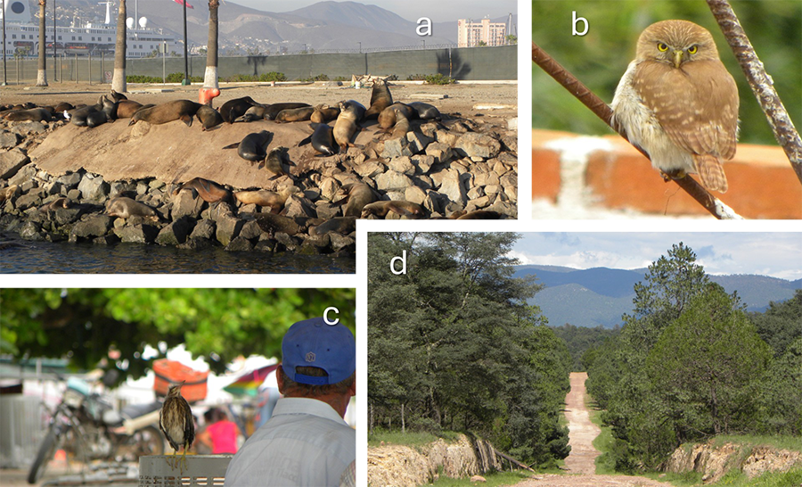 Fauna en ambientes urbanos (a: lobos marinos [Zalophus californianus] descansando en el rompeolas, Ensenada, Baja California; b: tecolote bajeño [Glaucidium brasilianum] perchado en una construcción, Coatepec, Veracruz; c: Pollo de garza verde [Butorides virescens] perchado en banca de un parque, Tlacotalpan, Veracruz) y d: camino en Reserva de la Biosfera La Michilía, Durango. Fotografías: autor